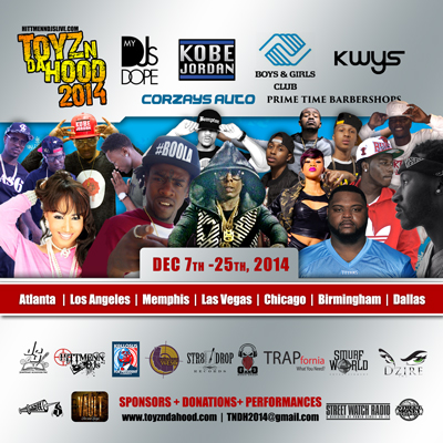 As we are reluctant to be in a major city that is the entertainment Mecca of Atlanta & LosAngeles as our bases. ToyzNDaHood “TNDH2014″ has been the rocket launch in many careers. Over 60% of Atlanta Artist that have sculptured themselves into stardom all played a part in being influential in giving back. 2014 we would like to introduce the startingf players for 2015 – Bandit Gang Marco, TKNCash[Now sign to Sony who has been on the community tour already this year], BankRoll Fresh [Who also has been on this year school tour] Monay + GlossDaboss who is now on their second run about to set up major platforms, Khaotic who is now building a strong buzz within the marketplace. Even in California the new artist making a statement HittmennWest + Trapfornia Brand Clothing CashumInn & Chris Classix , ComptonAV, ComptonWorld and popular promotional team TurnUpQueenz for setting the platform in LosAngeles. Also two MAJOR INDIE LABEL BRANDS who will be a surprise on this year TNDH. This development since 2001 has been the launching pad of several artist in the Alanta Market. Artist today and Independent label brands must develop two sides of relationships when it comes to the importance “RESEARCH”. The biggest one of course is having the music heard by DJs, Videos online, hashtag assertiveness. The biggest research plan is the everyday people in which building a real fanbase. As you google the timeline of “TOYZNDAHOOD” videos on “YouTube” look at the timeline in which each artist descends for major exposure. Kendrick Lamar, YG, Ciara, SouljaBoy, Gucci Mane, Wale,Chris Brown, 2 Chainz, Young Jeezy, Future, Dem Franchize Boyz, YC, Young Joc, Cali Swag, just to name a few. It wasnt all about rocking the “STAGE” its about making a difference in someones life. How Can you be a star when everyone else in the “CLUB” is thinking the same thing??? “Makes you wonder. We develop a program that gives the right away to the community and also gives you your next platform to be “NEXT”. IN CLOSING THIS KID WOULD LISTEN TO MY MUSIC …BECAUSE I SAID MERRY XMAS… and HE RECEIVED A BASKETBALL. [Something to think about]