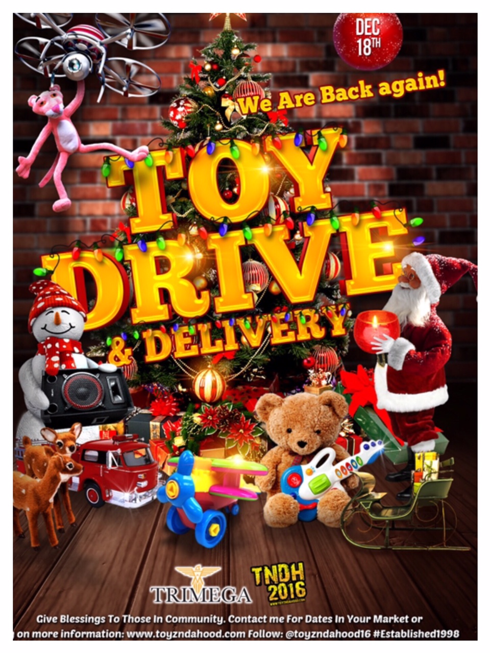 DECEMBER 18th , 2016 [7th Street] - We are happy to partner in collecting toys for the City of the great Prince to do the 2nd Annual – The Biggest Toy Drive Minneapolis has scene with its community drive given by Entertainment Imprint “TRIMEGA”. As we know in even the most confident states and Fortune 500 cities in America. With the largest mall to date Mall of America